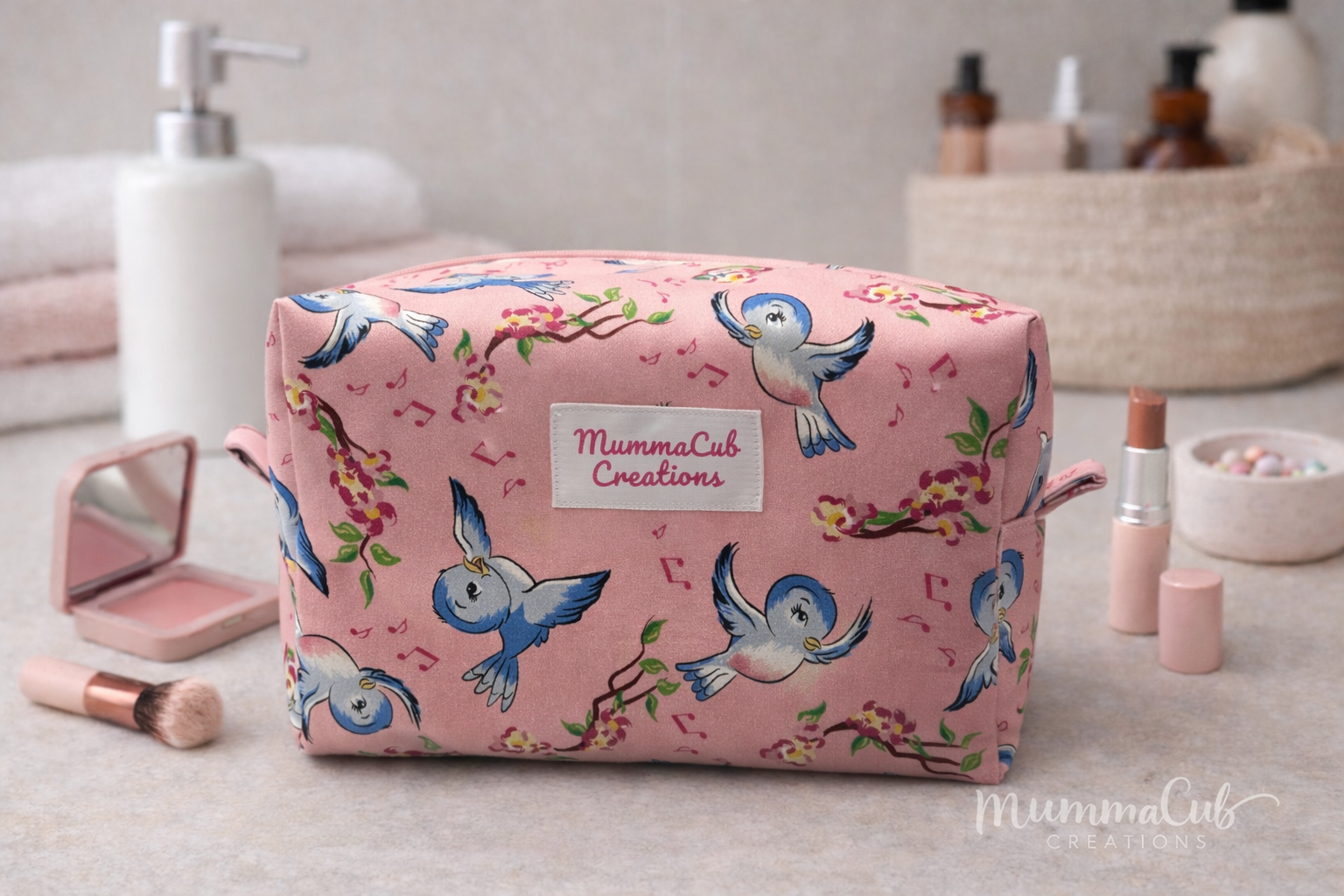 Toiletry/Make Up Bag Pink with Blue Bird Design